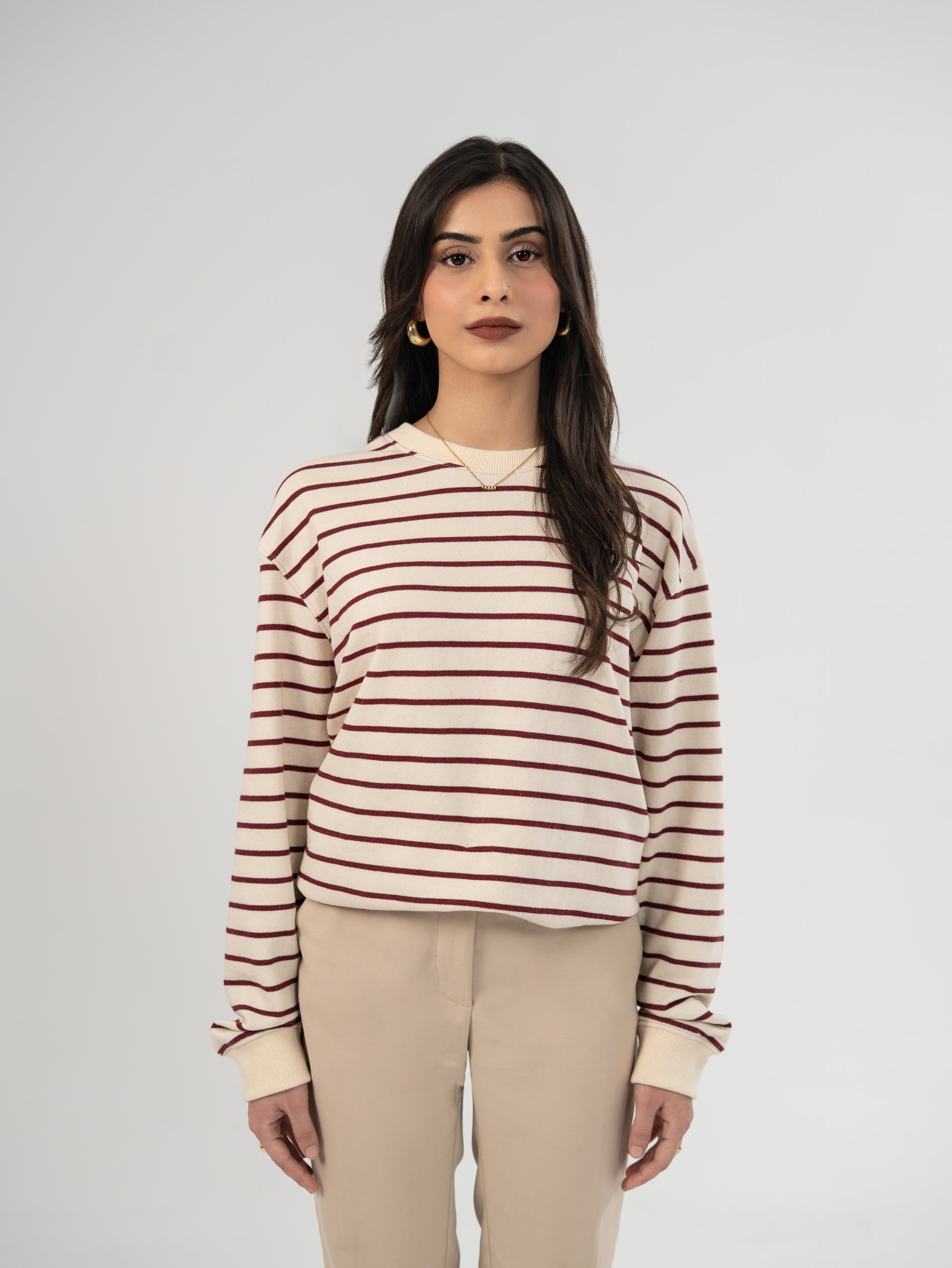 This unisex striped sweatshirt features an oversized fit for a relaxed and comfortable style. Crafted to provide ease of movement and a modern silhouette, it pairs effortlessly with casual or streetwear looks. Its classic striped pattern adds a timeless touch, making it a versatile wardrobe staple for all seasons.